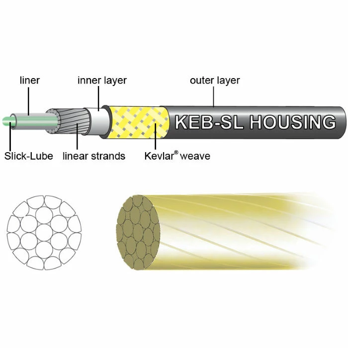 KEB-SL yderkabel: Dette yderkabel af høj kvalitet består af lineære strenge, som er Kevlar™-forstærkede, og viklet om en glatsmurt beklædning. Denne kompressionsløse indkapsling er en betydelig opgradering over spolet metal og starter med en konstruktion magen til Jagwires LEX skifteindkapsling, som reducerer vægt med 30 %. Det vævede Kevlar™ lag giver indkapslingen styrken og fleksibiliteten nødvendig til bremsebrug.