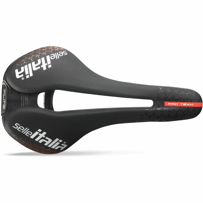 The Flite Boost Pro Team Carbonio Superflow features a flat shape that allows dynamic riders complete freedom of movement on the saddle, increasing performance.